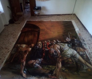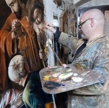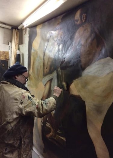 Filippo Maria Cazzolla è un artista versatile, maestro nella pittura e nella scenografia. Formatosi all’Accademia di Belle Arti di Bari, ha collaborato con prestigiosi teatri come il Petruzzelli e il Festival dei Due Mondi di Spoleto, affinando la sua conoscenza dei materiali e delle tecniche pittoriche. Trasferitosi a Bruxelles, ha studiato presso l’Institut Supérieur de Peinture Van der Kelen-Logelain, specializzandosi nel trompe-l'œil e nella pittura fiamminga.