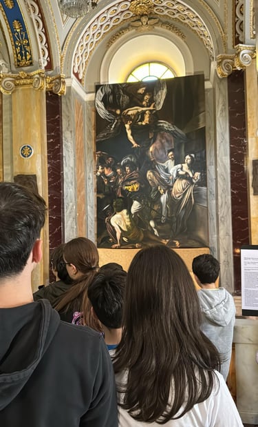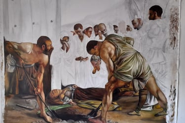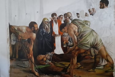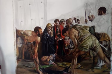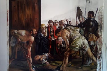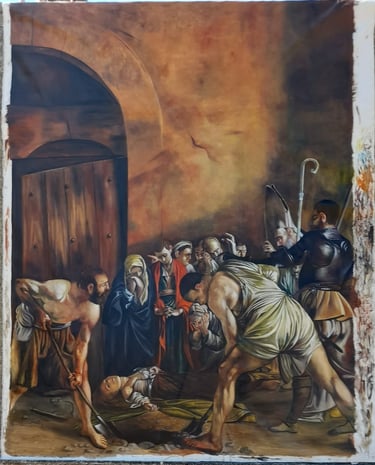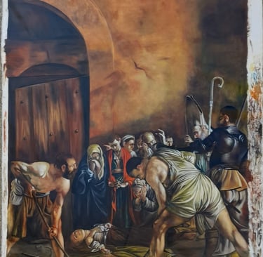 La luce tagliente e i toni scuri rendono il dipinto ancora più drammatico, mentre la resa dei volti e delle mani, carichi di dolore e mestizia, conferisce all’opera un’intensità emotiva fuori dal comune, rendendola una delle rappresentazioni più potenti del martirio cristiano.
