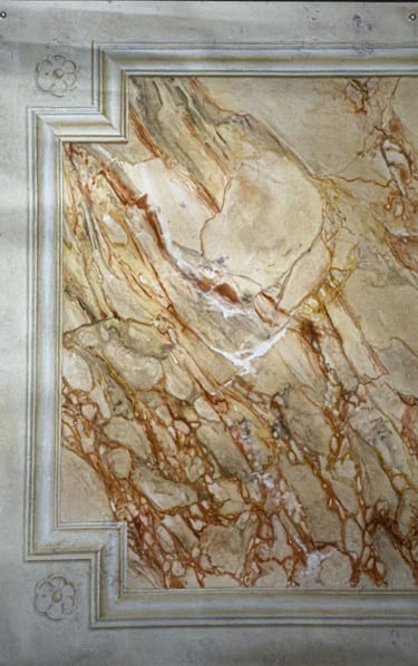 Il trompe-l'œil del Maestro Cazzolla è caratterizzato da una vividezza e un’accuratezza straordinarie, frutto di un metodo rigoroso e di un occhio attento alle più sottili variazioni cromatiche e luminose. Ogni superficie dipinta sembra acquisire volume e consistenza: il marmo riprodotto nelle sue opere restituisce la freddezza e le venature tipiche della pietra naturale, il legno appare con tutte le sue sfumature e nodi, mentre gli elementi architettonici dipinti simulano spazi e profondità con una precisione quasi fotografica. La capacità di ingannare l’occhio dello spettatore deriva non solo dalla sua abilità tecnica, ma anche da una comprensione profonda della luce e della percezione visiva, che gli permette di creare illusioni perfettamente integrate nell’ambiente in cui vengono collocate.